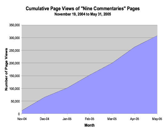 Since the Epoch Times website is blocked in China, many Chinese have used the services of DynaWeb to access the web site to read the "Nine Commentaries." Our records show that between November 19, 2004 and the end of April 2005, the first of the "Nine Commentaries" received 71,000 page views. Page views for all nine commentaries combined on the DIT website add up to 307,202 as of May 31, 2005. Please refer to the table below for details. The output results from the webalizer tracking tool are also viewable directly on the DIT website at: http://www.dit-inc.us/work/9phtml.