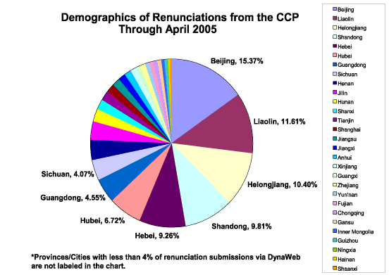 People from 29 provinces or directly governed cities submitted renunciation statements online via DynaWeb. People from Beijing are especially active: while only comprising 4.3% of the total Internet users in China, renunciation requests from Beijing composed 15% of the total. Shanghai has only 1.6%. These demographic data conform to the view that Beijing residents are more politically savvy with many having experienced the June 4th massacre, while Shanghai residents are more economically oriented.